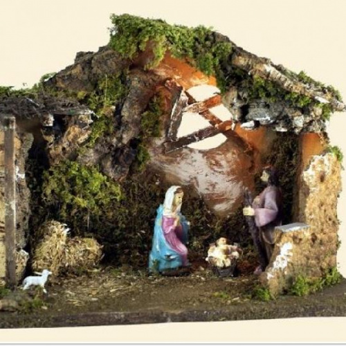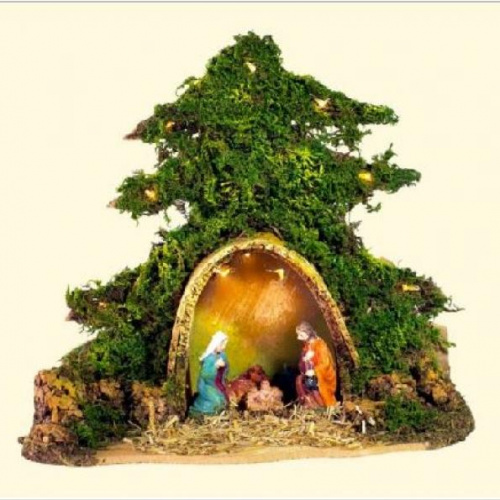 Paesaggio presepe artigianale realizzato in resina, sughero, muschio e corteccia con baite e grotta, luci funzionanti...