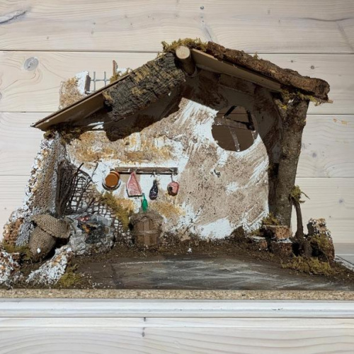 Capanna vuota, con angolo focolare con luce effetto fuoco, barile e salumi, realizzata con legno sughero, corteccia...