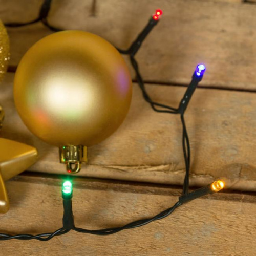 Catena lineare 24 LED multicolor. Memory controller integrato nel porta batterie. Luce fissa + 7 giochi di luci selezionabili + off. Timer On-OFF 8/16 ore. 3 batterie AA 1,5 V (non incluse). Uso esterno. Cavo verde. Dimensioni 0,5+0,9 mt